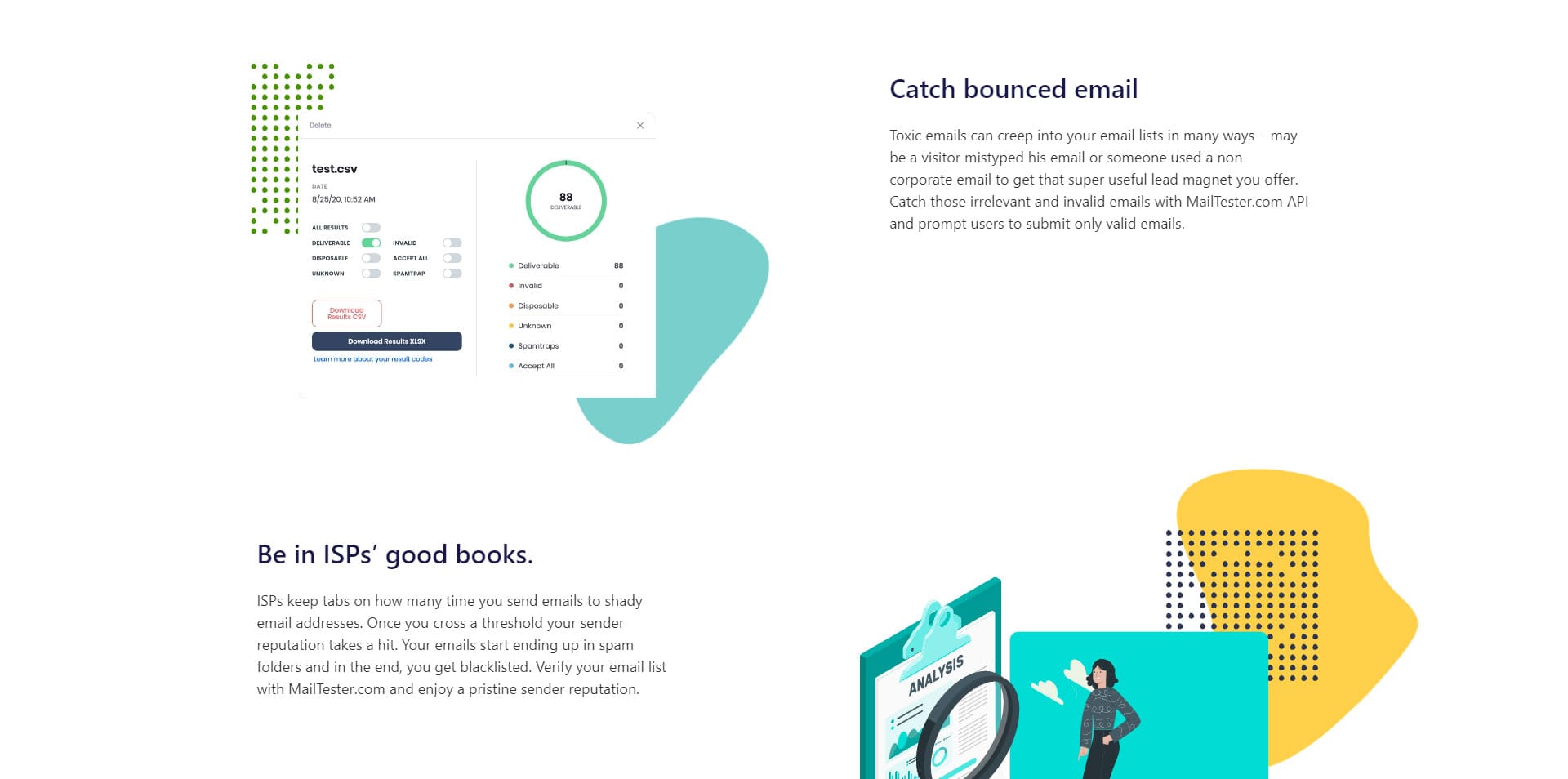 MailTester.com’s easy-to-integrate API allows you to automate the email collection process and prevent bad emails from getting into your list at the same time. MailTester.com provides Python, Ruby, C# and PHP API libraries.