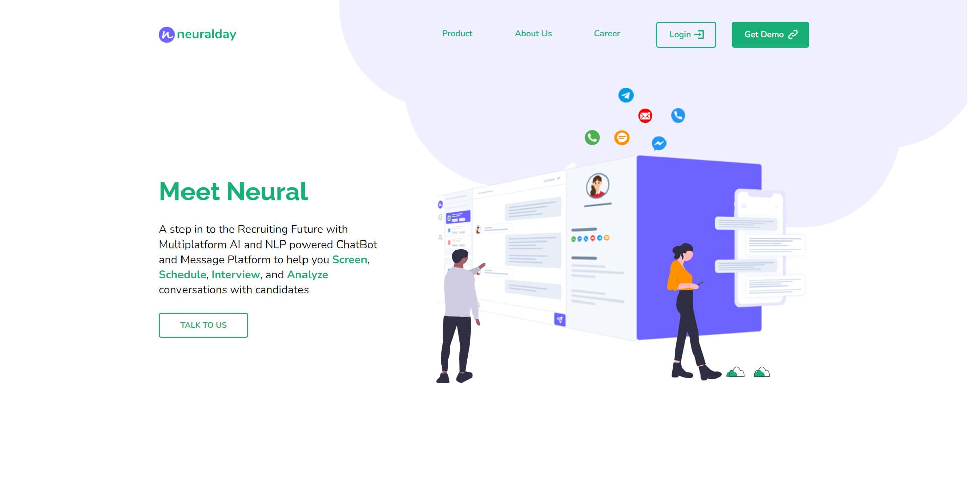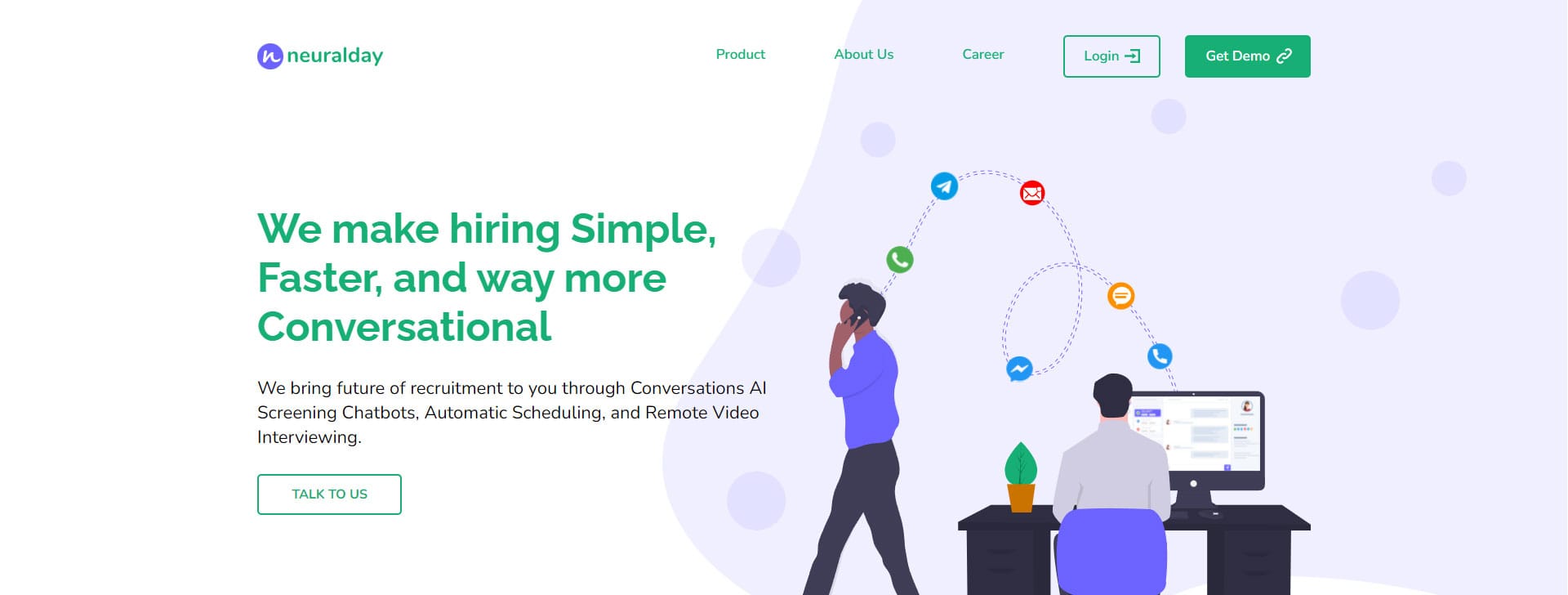 NeuralDay bring future of recruitment to you through Conversations AI Screening Chatbots, Automatic Scheduling, and Remote Video Interviewing.